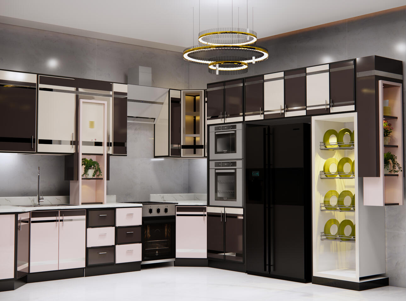A premium kitchen design with glossy black cabinetry, integrated appliances, and a striking ring chandelier.