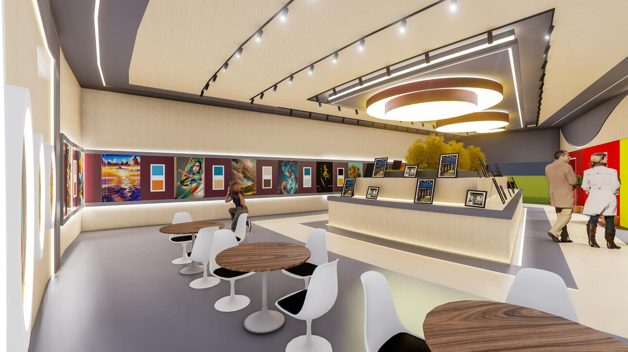 A modern gallery lounge blending casual seating pods with bold wall art and a glowing central display for laid-back creativity.