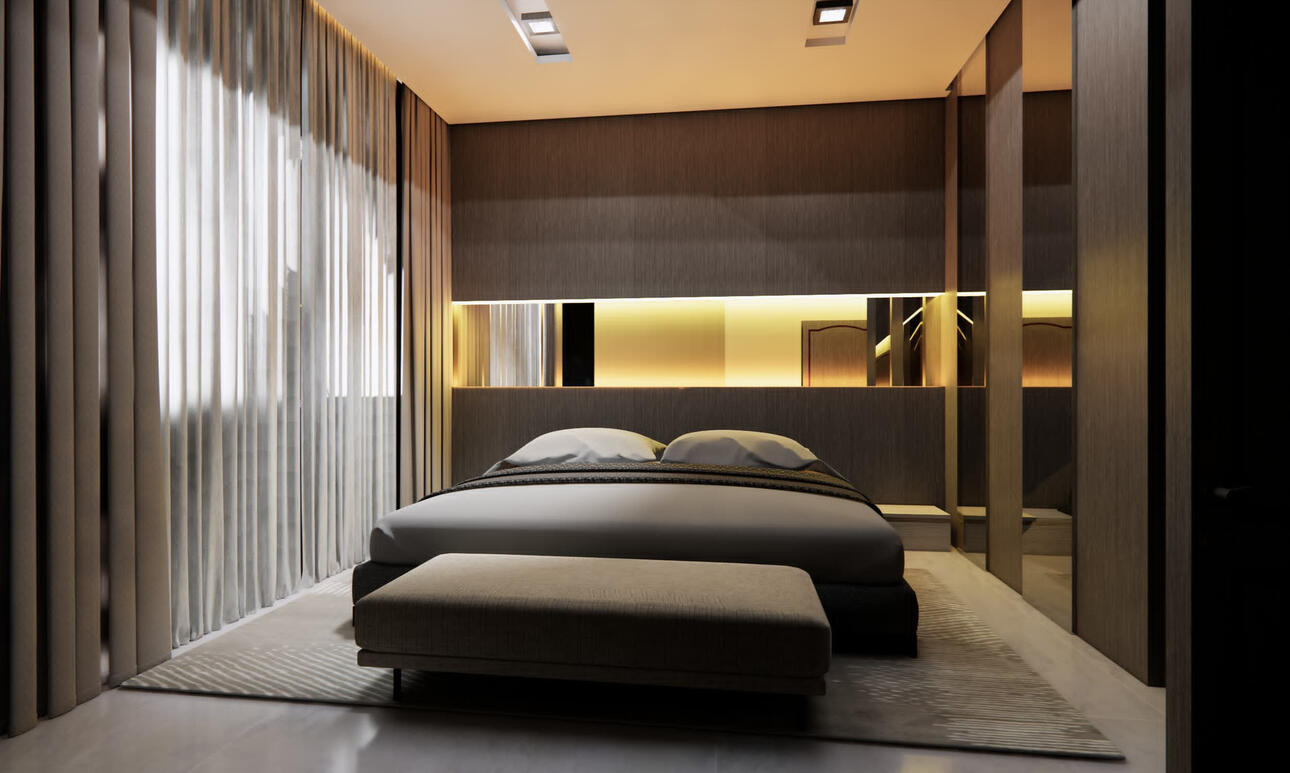 A cozy suite with floor-to-ceiling drapes and subtle backlighting creating a calm, cocoon-like atmosphere.