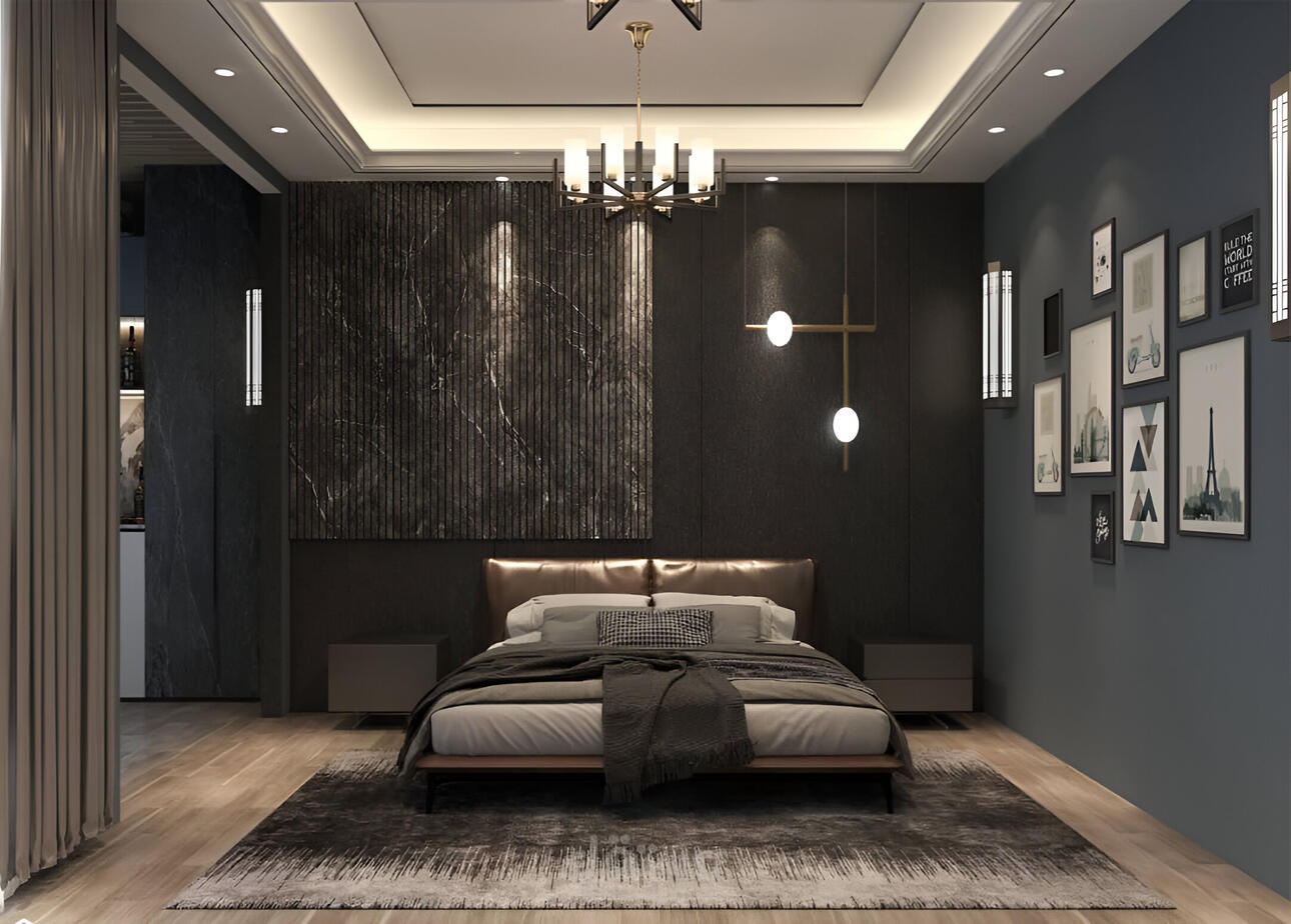 A sophisticated bedroom with moody charcoal walls, textured paneling, and curated wall art for intimate luxury.