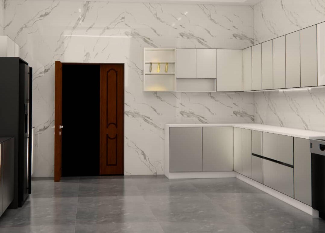 A spacious culinary space with seamless white cabinets, marble surfaces, and concealed task lighting for a clean aesthetic.