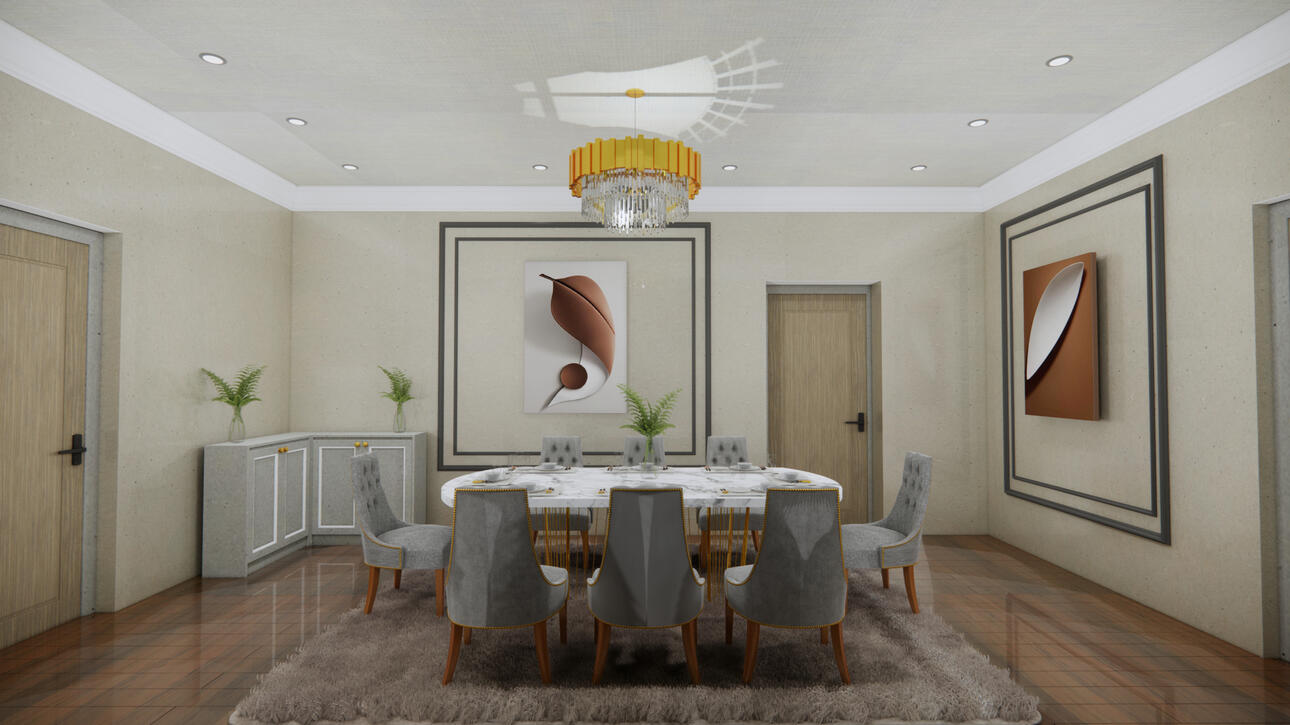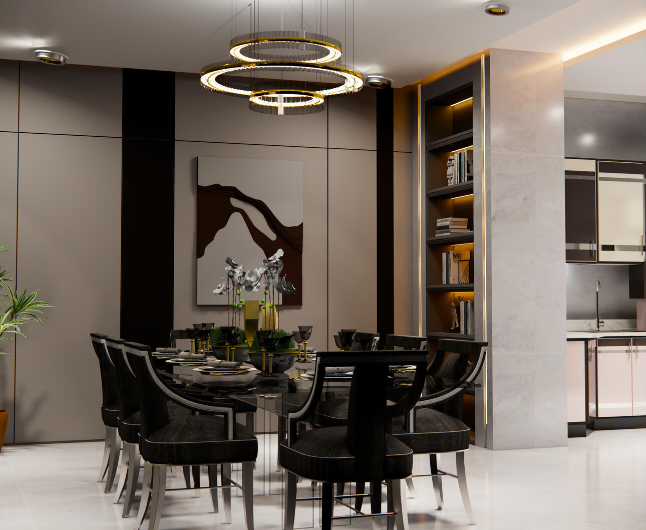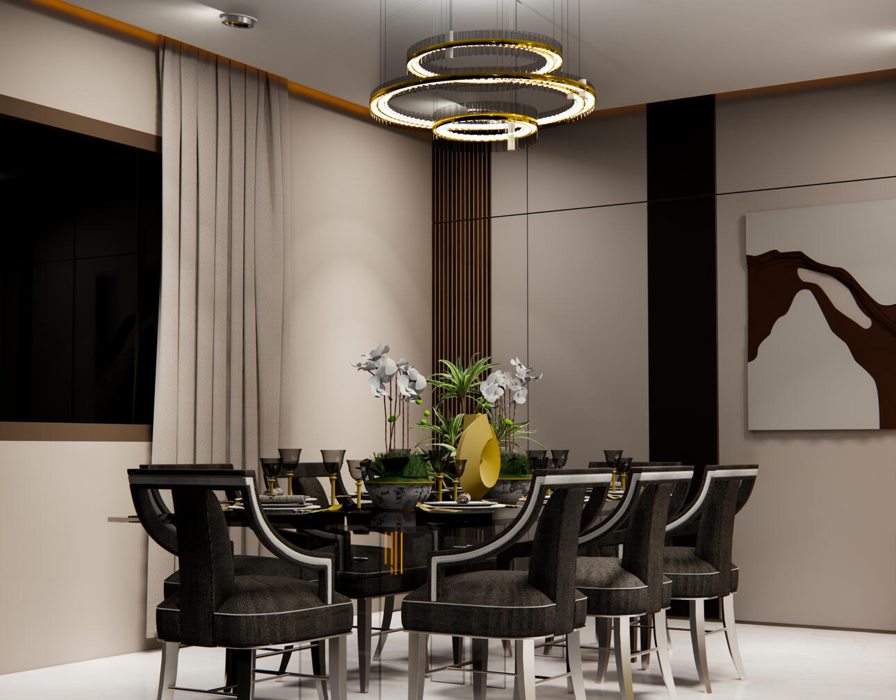 A refined dining space with modern decor, showcasing elegant furniture and a harmonious blend of colors, perfect for social gatherings and relaxation.