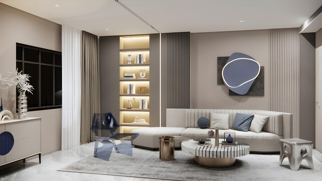 An inviting living area blending sculptural seating, illuminated display niches, and abstract art for modern elegance.