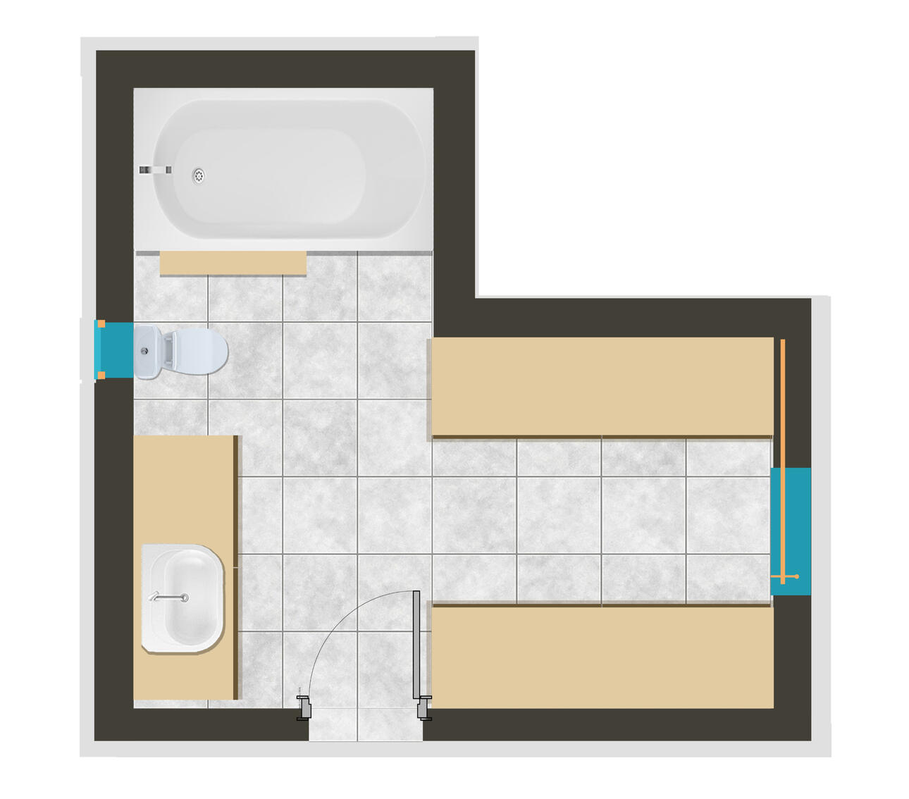 A functional bathroom design featuring an L-shaped vanity run, ample cabinetry, and a recessed tub to balance storage and comfort.