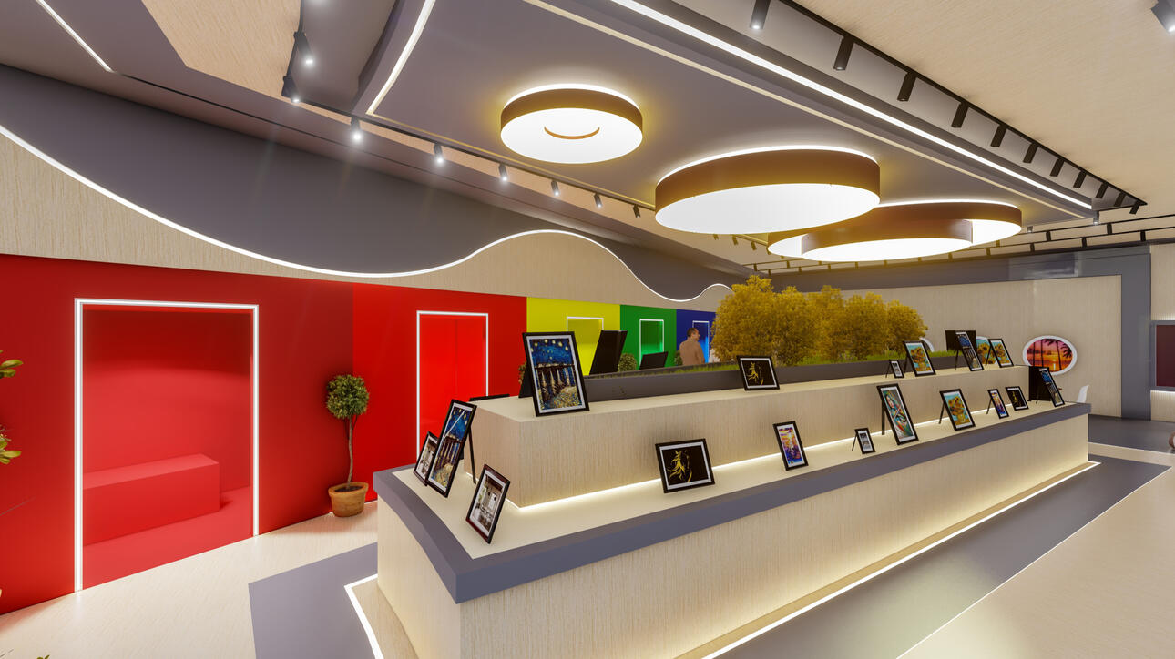 An illuminated exhibit counter showcasing framed works under sculptural ring lights and vibrant red accents.