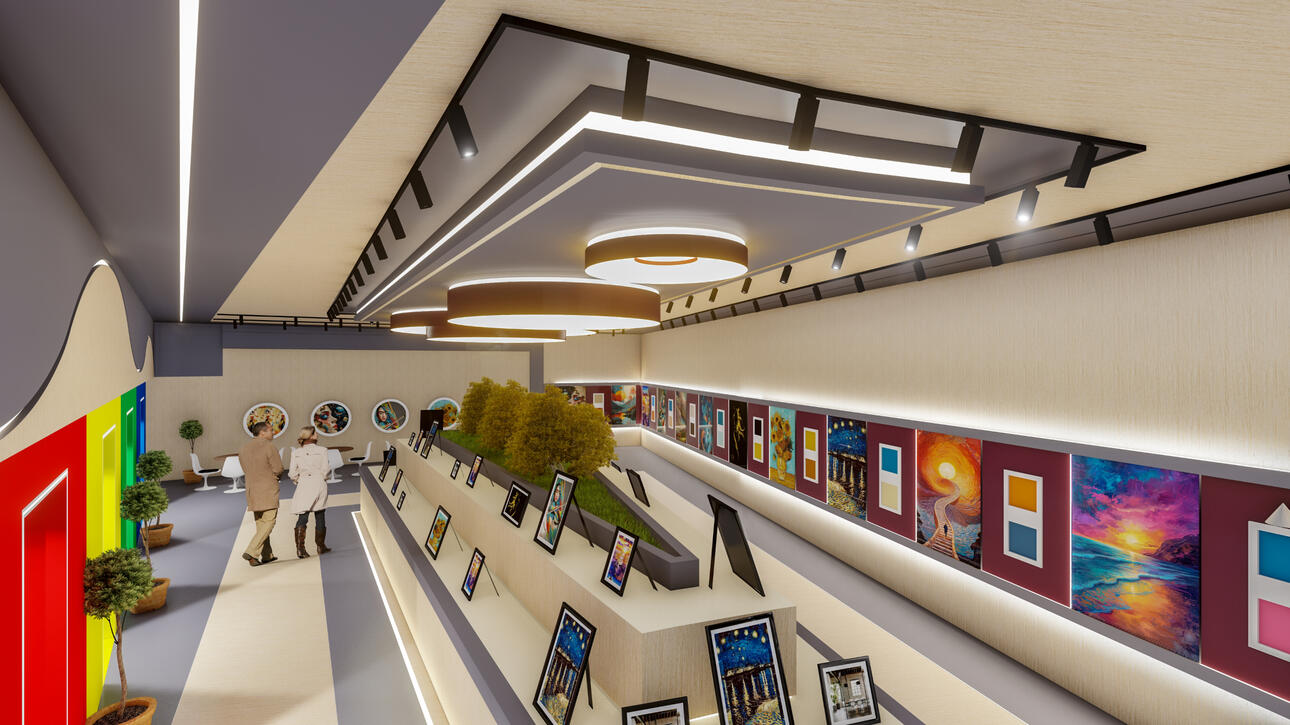A sweeping exhibition aisle lined with colorful paintings and an interactive centerpiece, inviting visitors to explore.