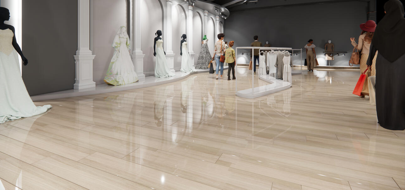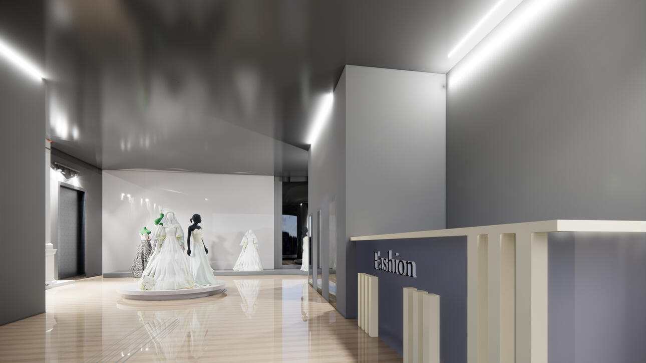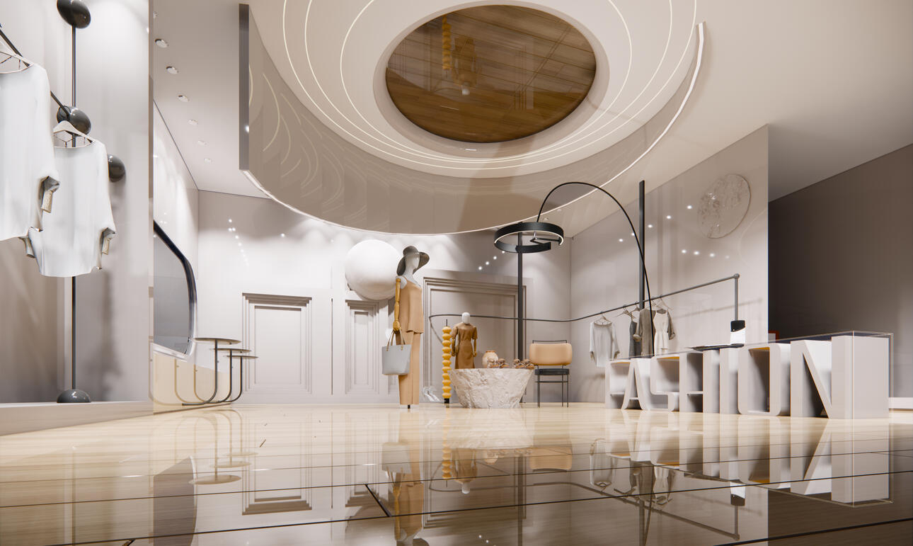 A polished entry with glossy floors, concentric ceiling rings, and a sleek reception counter that elegantly introduces guests to the couture collection.