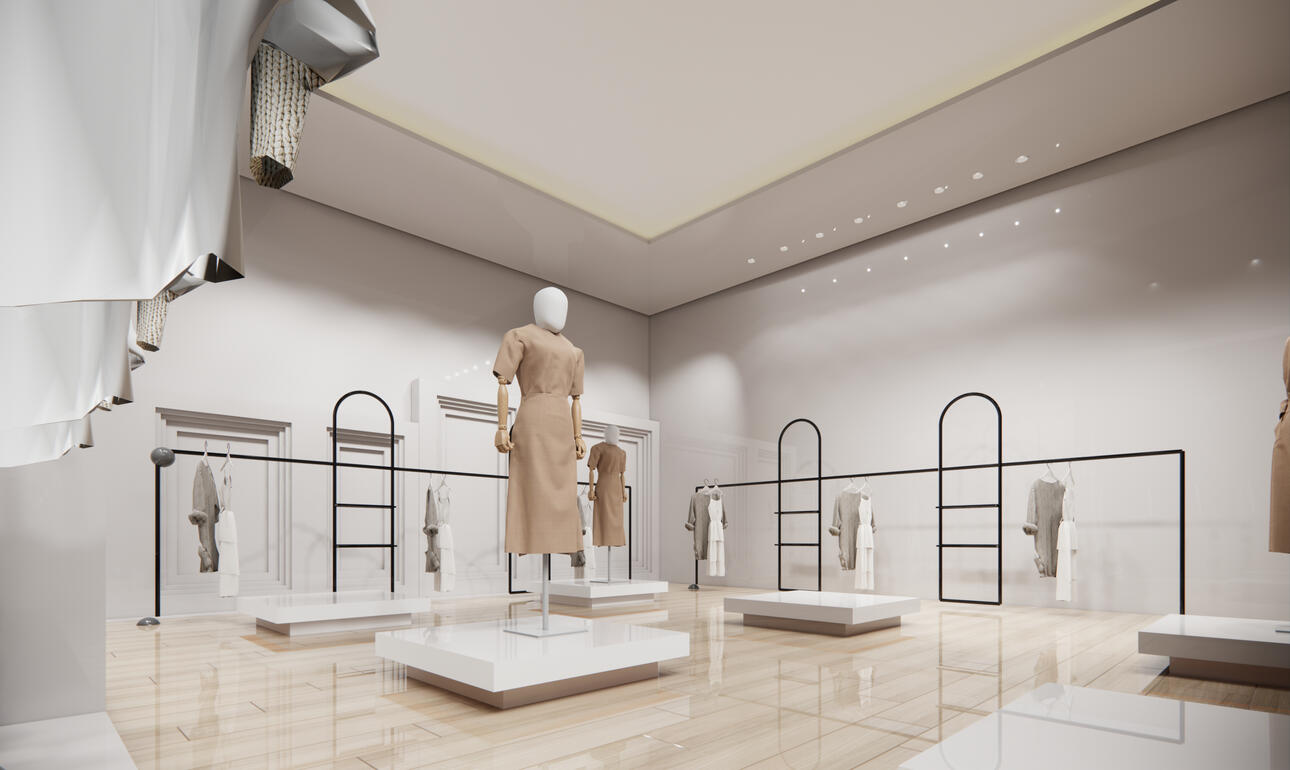 An airy fashion space with pedestal-mounted mannequins, streamlined black tubular racks, and soft cove lighting that elegantly accentuates each premium piece.