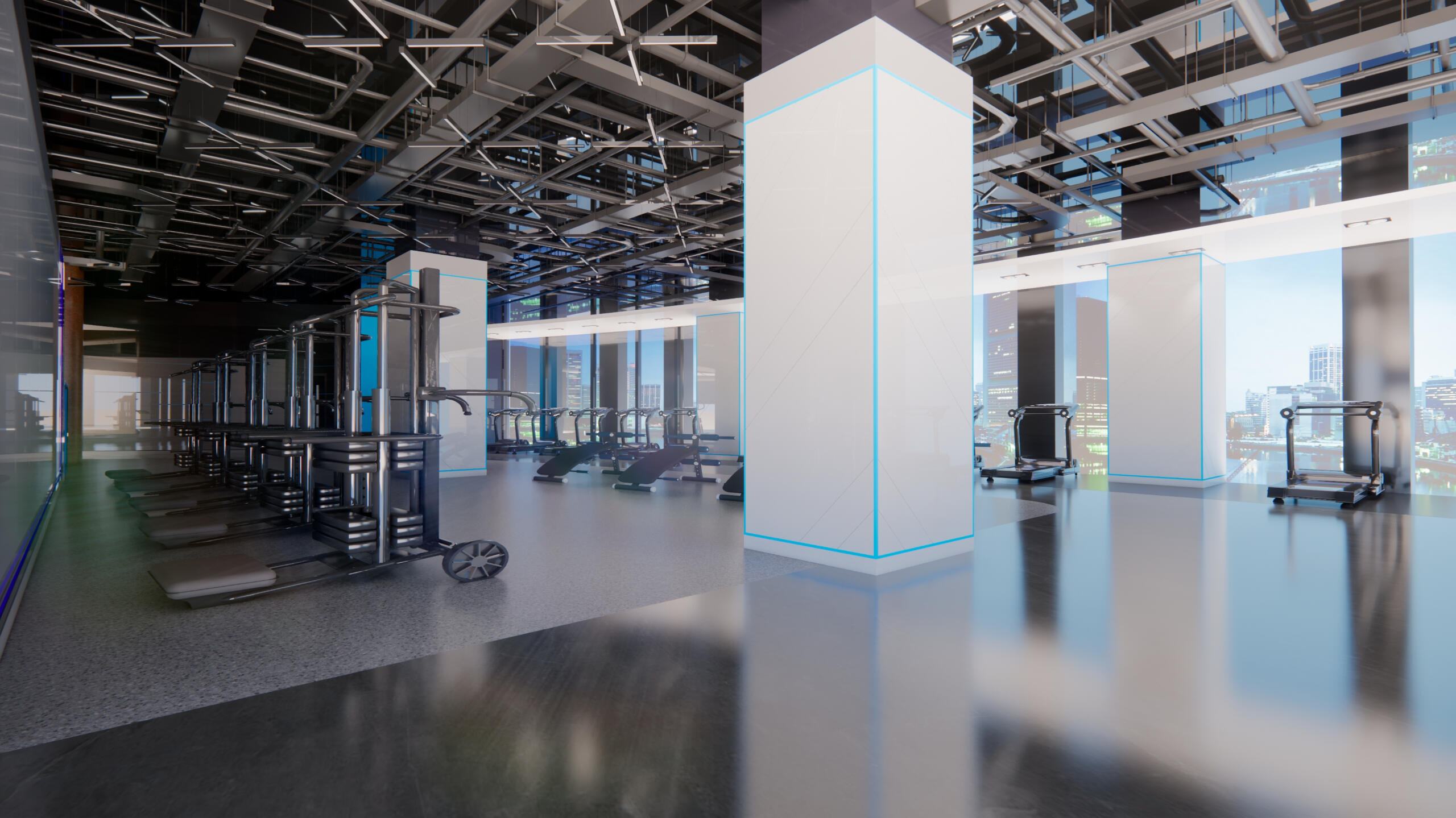 A sleek and spacious fitness studio equipped with state-of-the-art treadmills and a minimalist design, promoting an inspiring workout environment.