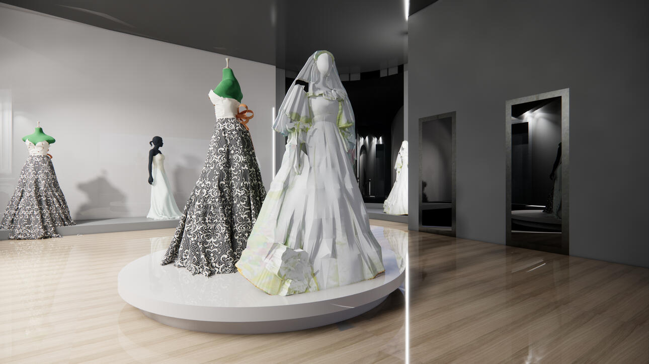 A sculptural circular plinth spotlighting intricately detailed dresses, surrounded by mirrored walls and minimalist racks for a modern atelier ambience.