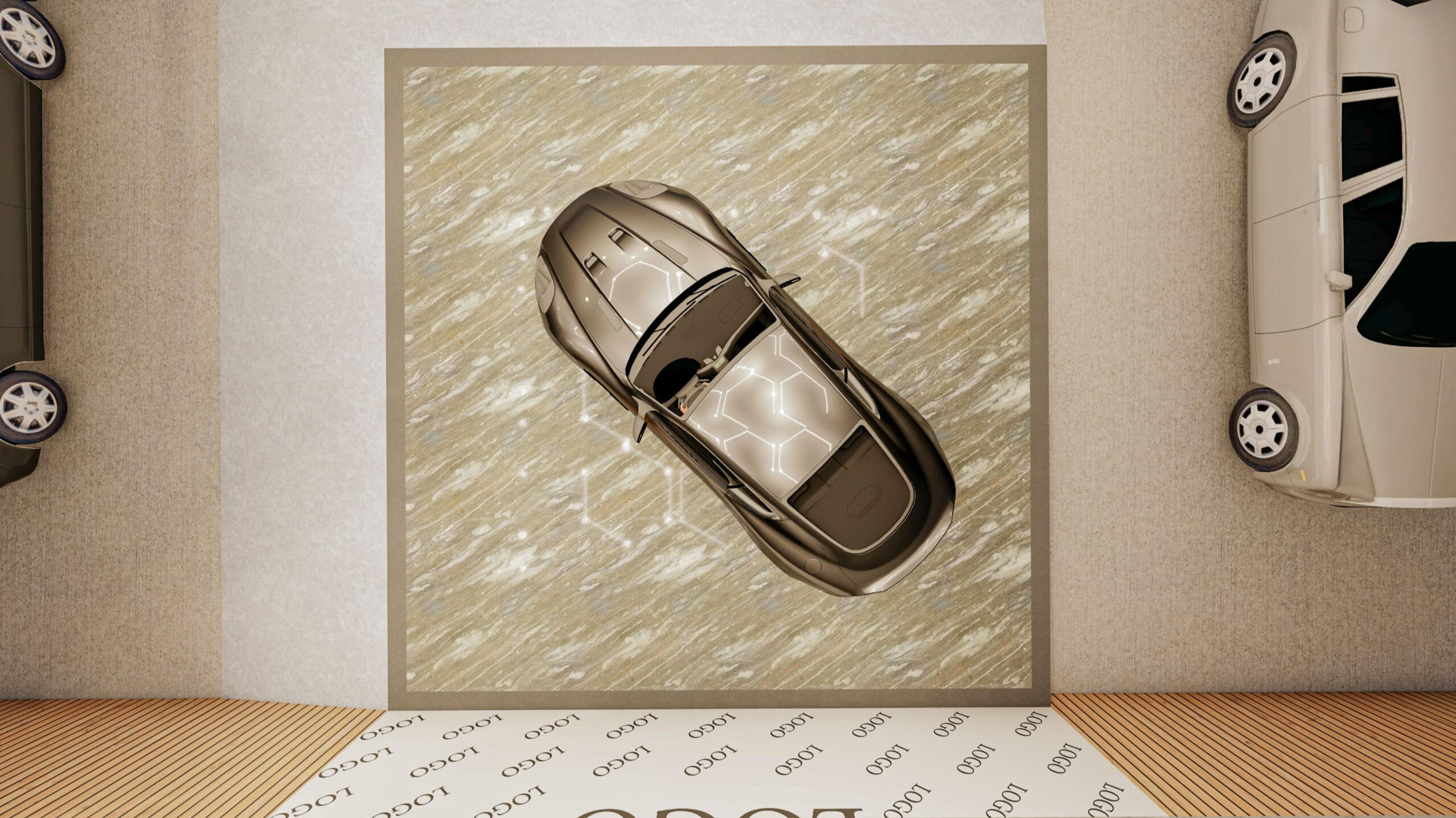 modern exhibition space features a sleek design with wooden accents, highlighting luxury vehicles. The central focus is on a sophisticated car displayed on an elegant patterned floor, with branding prominently featured in the backdrop. Perfect for showcasing cutting-edge automotive designs and innovations.