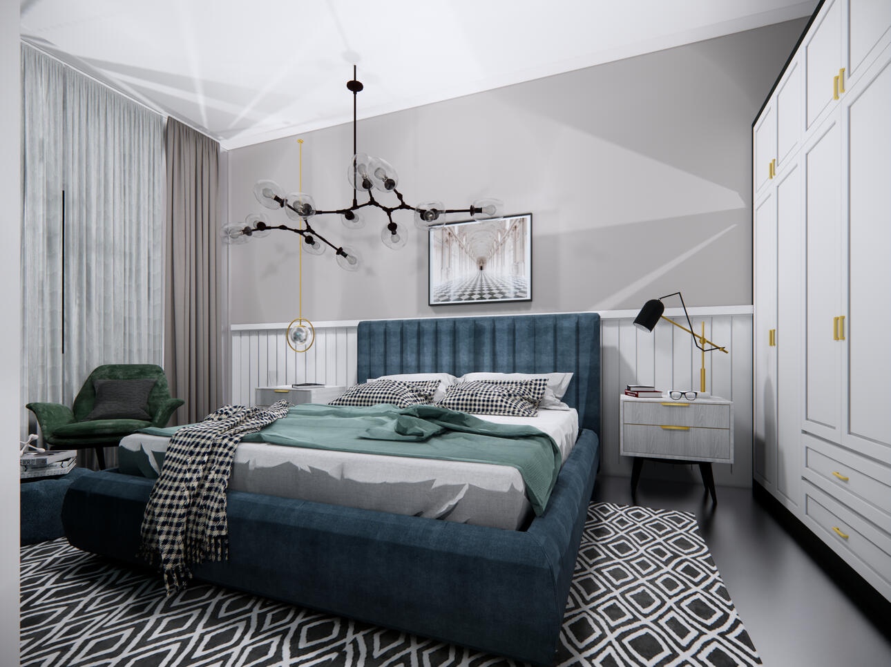 A chic bedroom featuring a plush blue bed, geometric rug, and ambient overhead lighting for serene nights.