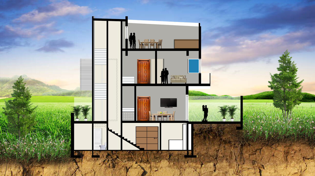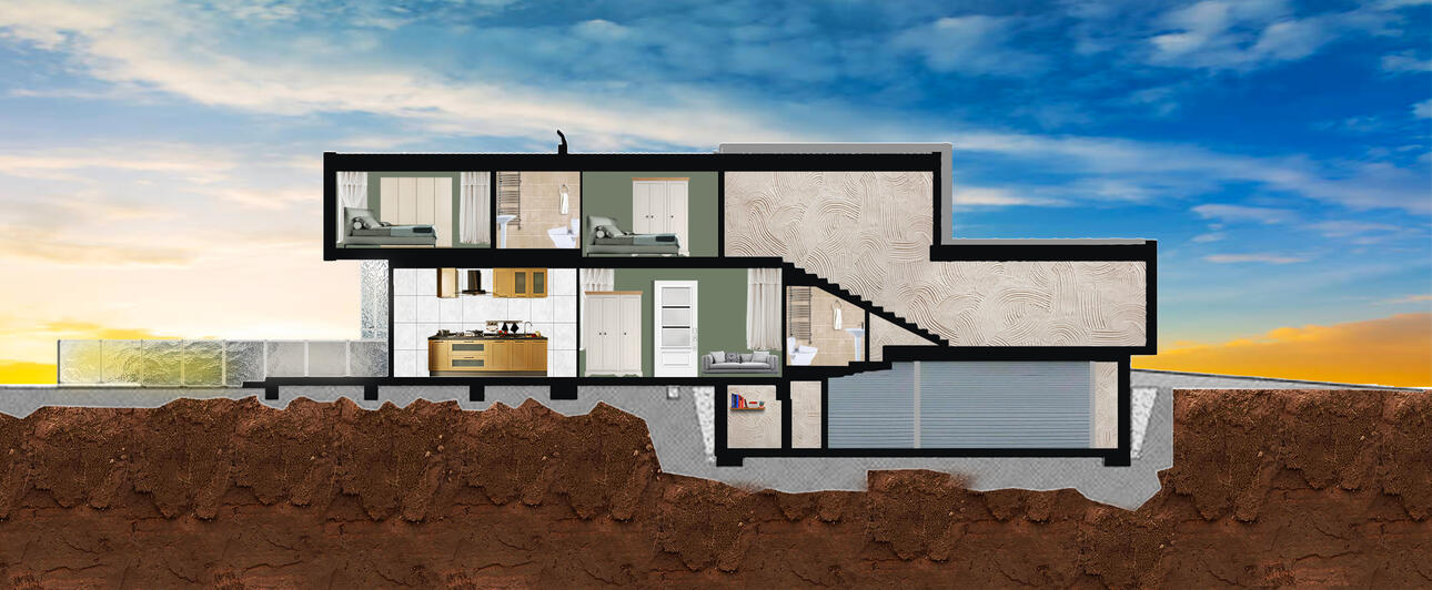 Refined cut-through view shows seamless flow from top-floor bedrooms through the living area to semi-buried parking, framed by tranquil landscape