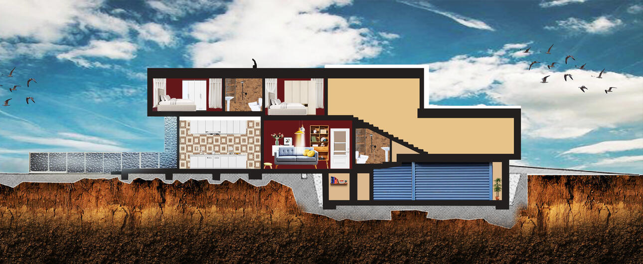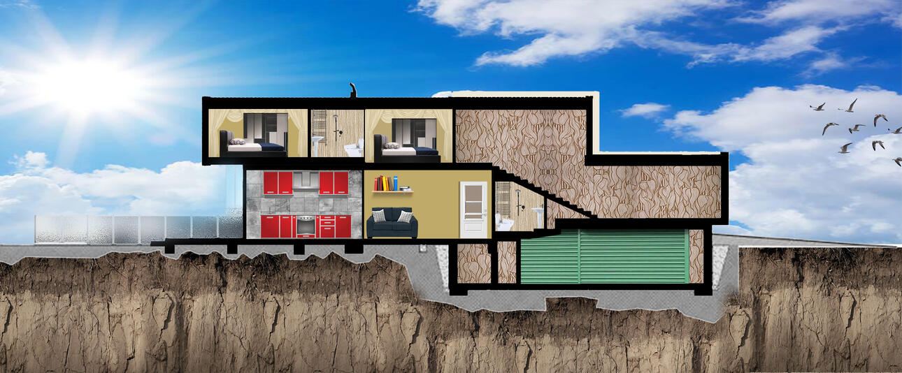 Vibrant sectional illustration layers bedrooms above, open living/kitchen mid-level, and recessed garage below.