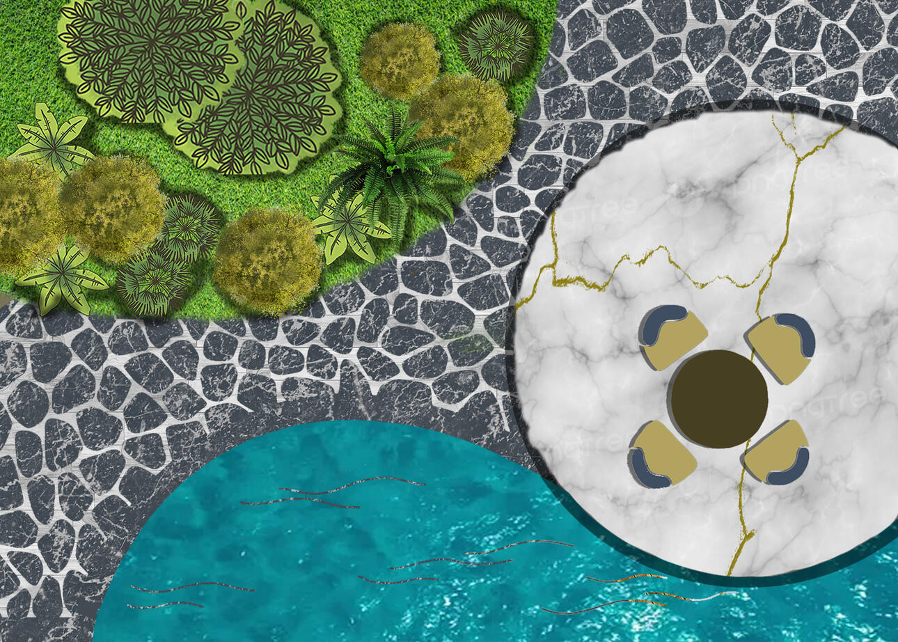 A rendered top-view showcasing textured cobblestone paving weaving through lush planting beds, culminating in a circular marble dining alcove at the water’s edge.