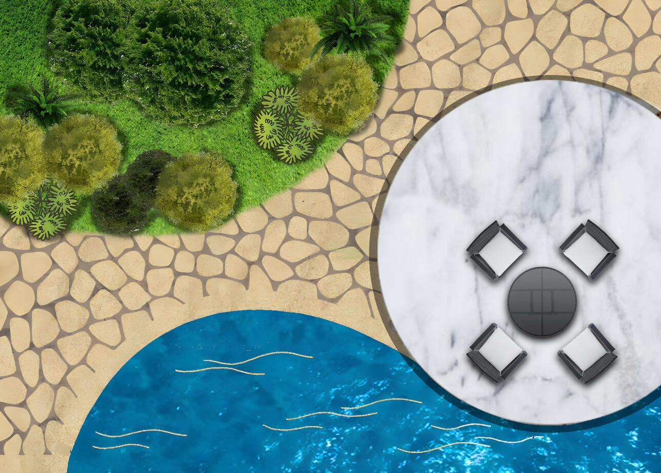 An aerial layout combining warm sandstone pavers, verdant greenery clusters, and a round marble seating platform overlooking tranquil blue waters.