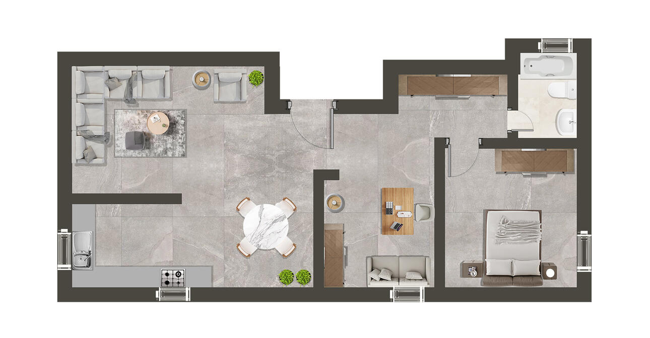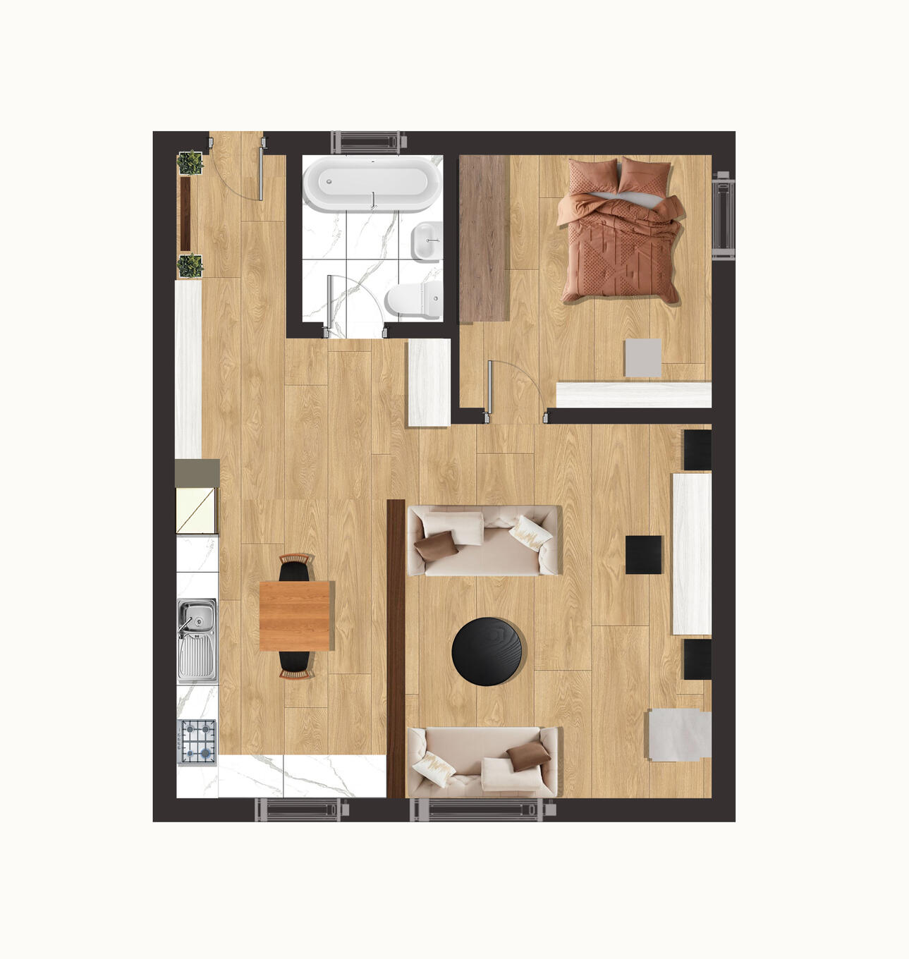 Integrated living, dining, and kitchen zones flow seamlessly into a serene bedroom and sleek marble-clad bathroom.