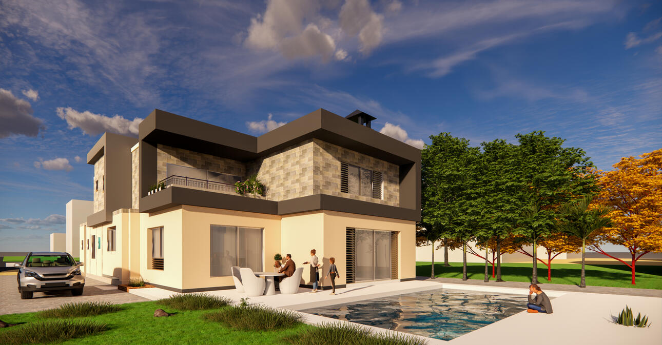 A modern two-story villa merging smooth plaster and textured stone cladding, complete with a sleek pool terrace and alfresco lounge for relaxed gatherings.