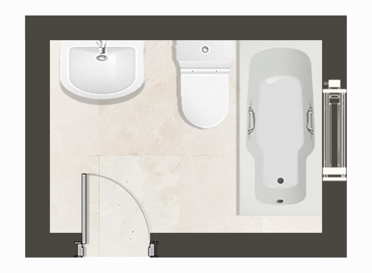 A streamlined layout with a wall-mounted sink, toilet, and bathtub arranged for maximum efficiency in a small footprint.